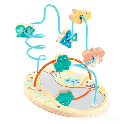 - Contenido: un ábaco de madera con dos varillas de metal, sobre las que se deslizan cuentas con forma de animales como pájaros, ranas y mariposas. Además, incluye un pequeño espejo en el que se reflejan los animales mientras se mueven.