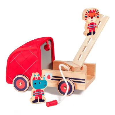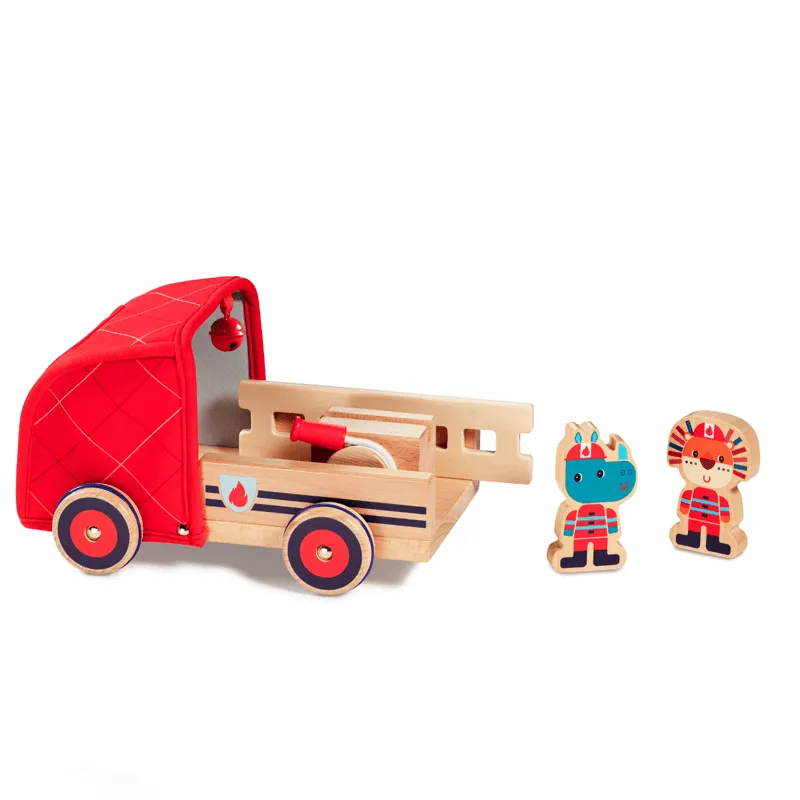 ¡Fuego, fuego hay que llamar a los bomberos! Jack el león y Marius el rinoceronte van a intervenir, sacan la escalera grande y desenrollan la manguera para sofocar las llamas. Descubre este camión de bomberos, un original juguete de madera y neopreno para niños a partir de 2 años, con el que se divertirán inventando bonitas historias de bomberos.