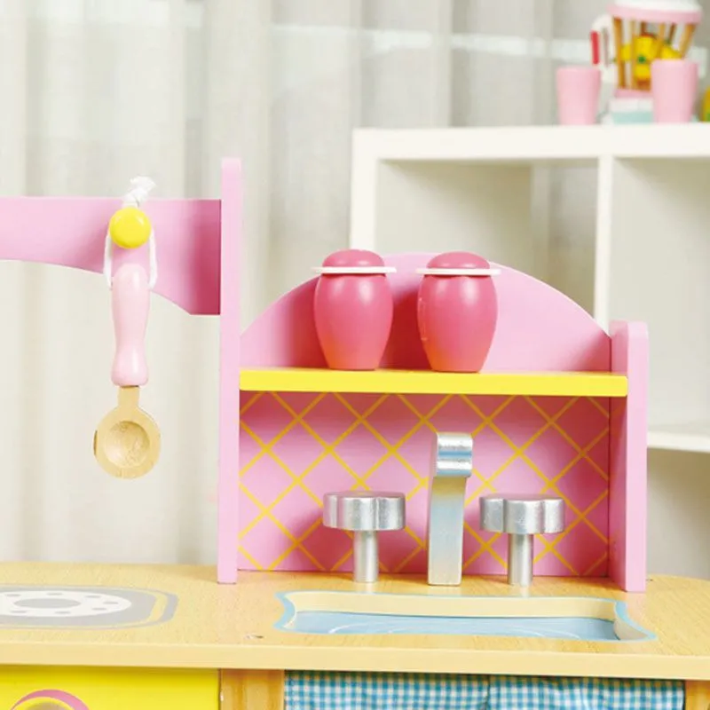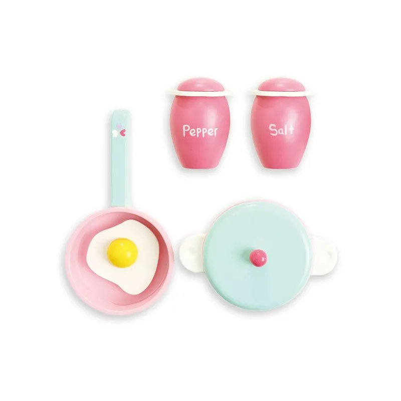 ¿Jugamos a las comiditas? Sencilla y robusta cocinita de diseño tradicional en tonos rosas y con 7 utensilios de cocina incluidos para hacer más realista el juego.
