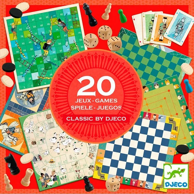 La colección 20 Juegos Clásicos de Djeco es la colección definitiva de todos los juegos de mesa familiares en una caja resistente. Se incluyen ludo, serpientes y escaleras, ajedrez, damas y muchos más juegos clásicos, todos ellos bellamente ilustrados.