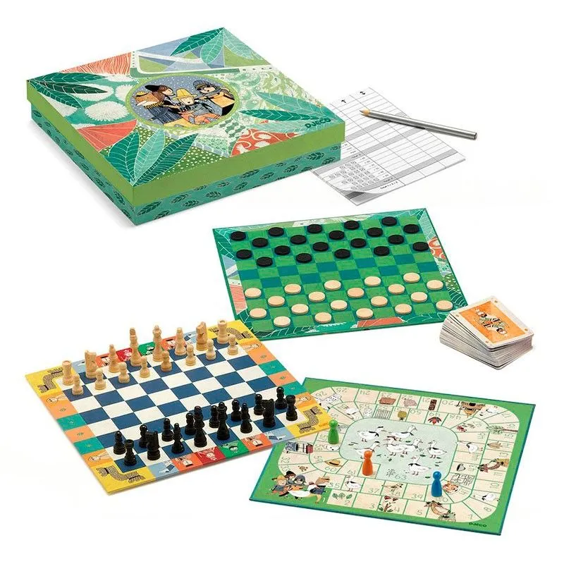 - Contenido: 20 juegos de mesa clásicos 3 tableros reversibles (caballos/juego de la oca, ajedrez/escaleras y serpientes, damas/juego del molino), 16 peones de madera, 40 fichas de damas, 32 piezas de ajedrez, 5 dados, 1 cuadernillo de puntuación y 1 baraja de 54 cartas y reglas del juego en 10 idiomas.