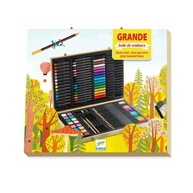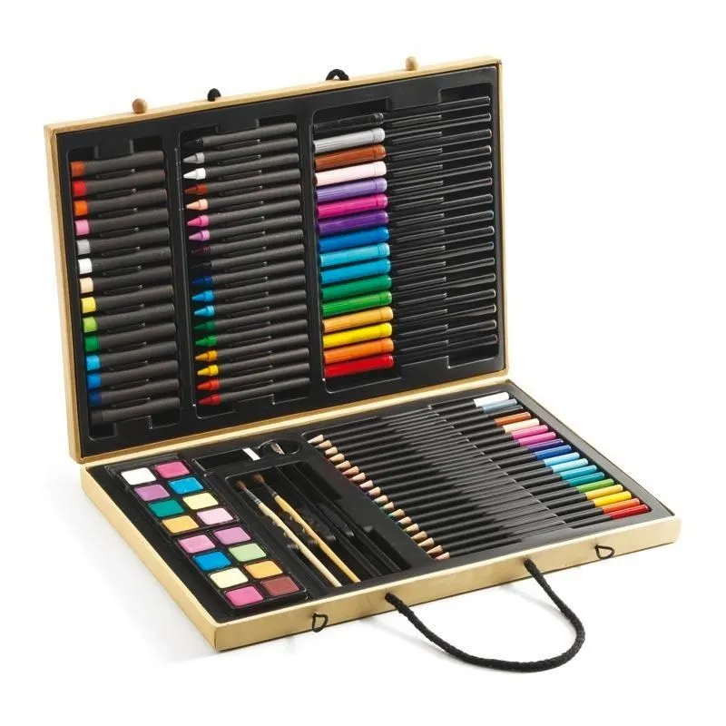 ¡Un maletín de lujo con 88 piezas que contiene todo lo que tu pequeño artista necesita para crear su propia obra maestra! Todo perfectamente organizado en un práctico estuche de madera adornado con una cenefa para colorear y personalizarlo por ambas partes. ¡El regalo perfecto para fomentar su creatividad!