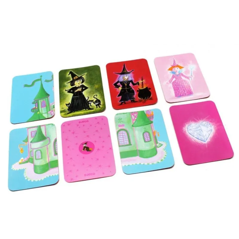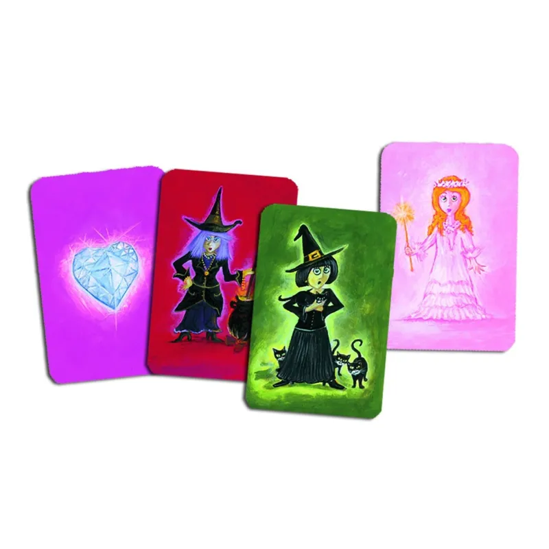 - Contenido: 55 cartas 24 cartas de castillo (hace 4 castillos grandes), 20 cartas de diamantes, 8 cartas de brujas, 3 cartas de hadas e instrucciones en 10 idiomas.