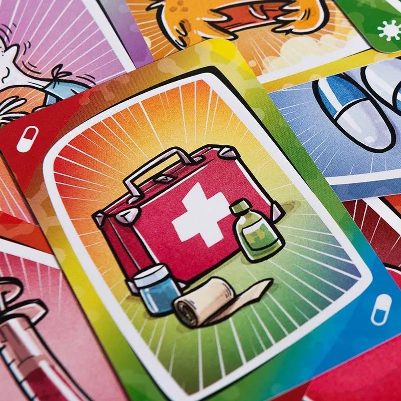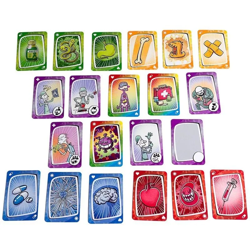 - Contiene: 68 cartas divididas en 4 tipos (cartas virus., cartas órganos, cartas medicinas, cartas tratamientos) 2 cartas personalizables e instrucciones en castellano.