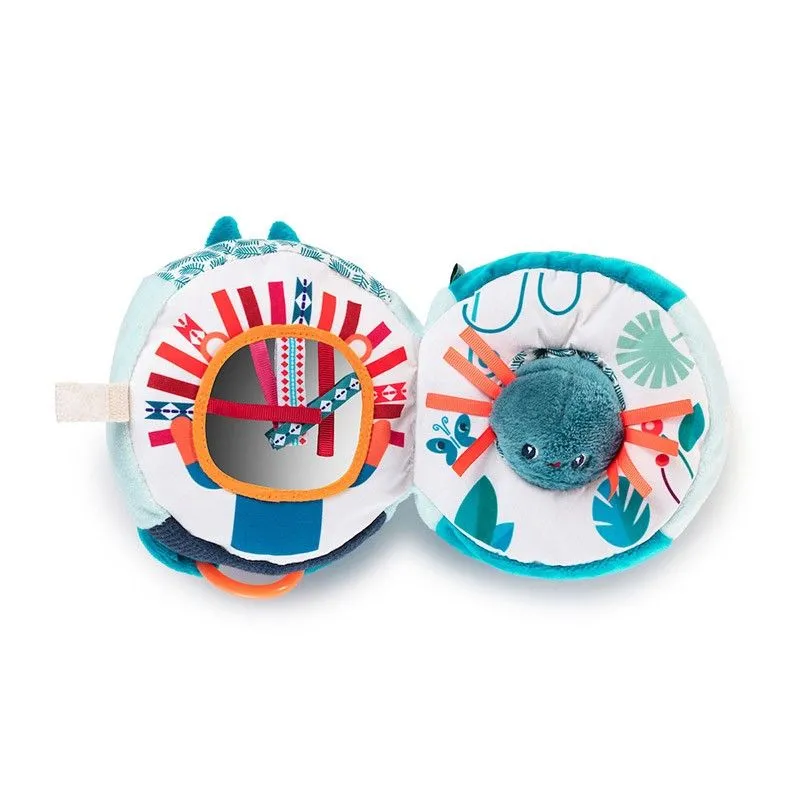 - Contiene: en el exterior, su carita es de papel sonoro, su hocico toca el saxofón si lo aprietas, tiene un anillo de dentición y una bola de madera deslizable. En su interior, encontramos un espejo con etiquetas, una arañita que vibra y un cascabel.