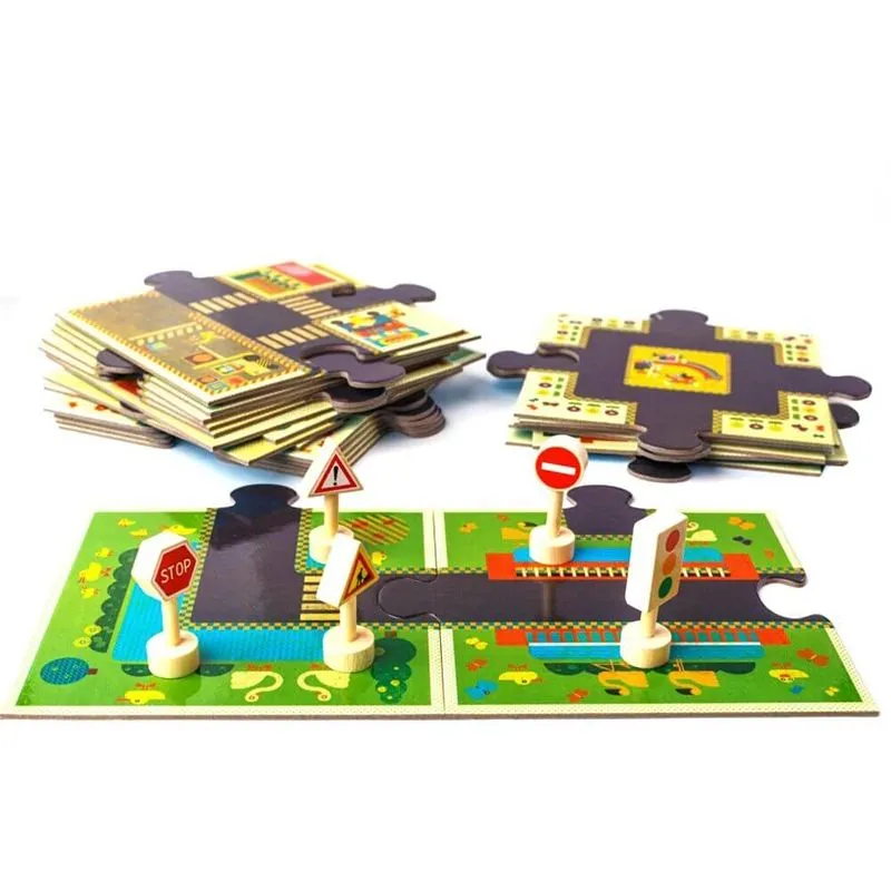 - Contiene: un puzle de 24 piezas de cartón grueso y 5 señales de tráfico de madera.