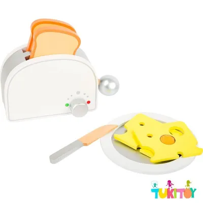 ¡Qué rico desayuno! Original y completo set de 7 piezas de madera maciza con: tostadora, 2 rebanadas, 2 lonchas de queso, un cuchillo y plato. El accesorio para cocinitas de juguete imprescindible para desarrollar el juego simbólico.